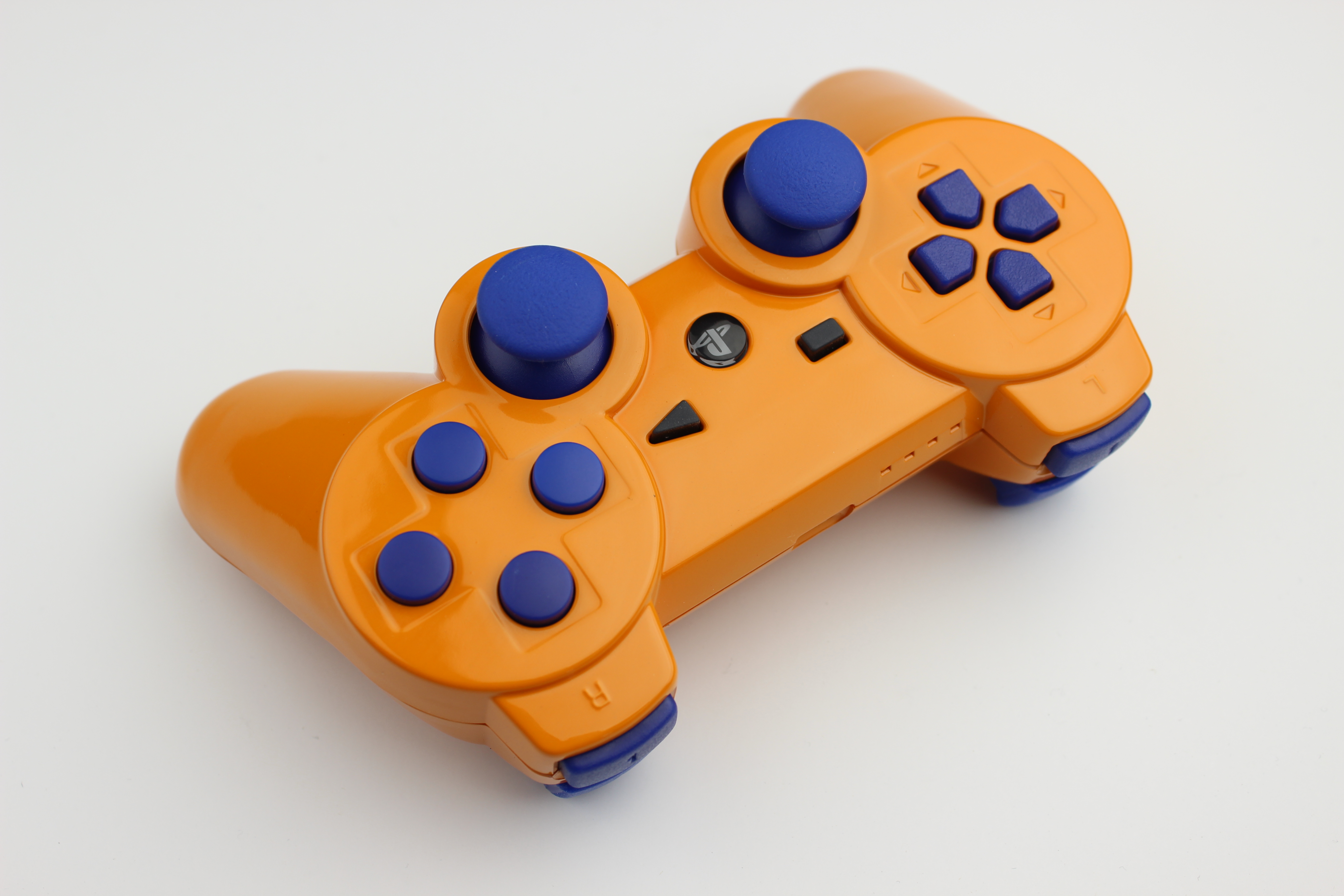 Orange PlayStation 3 Controller with Blue Buttons photos and movies