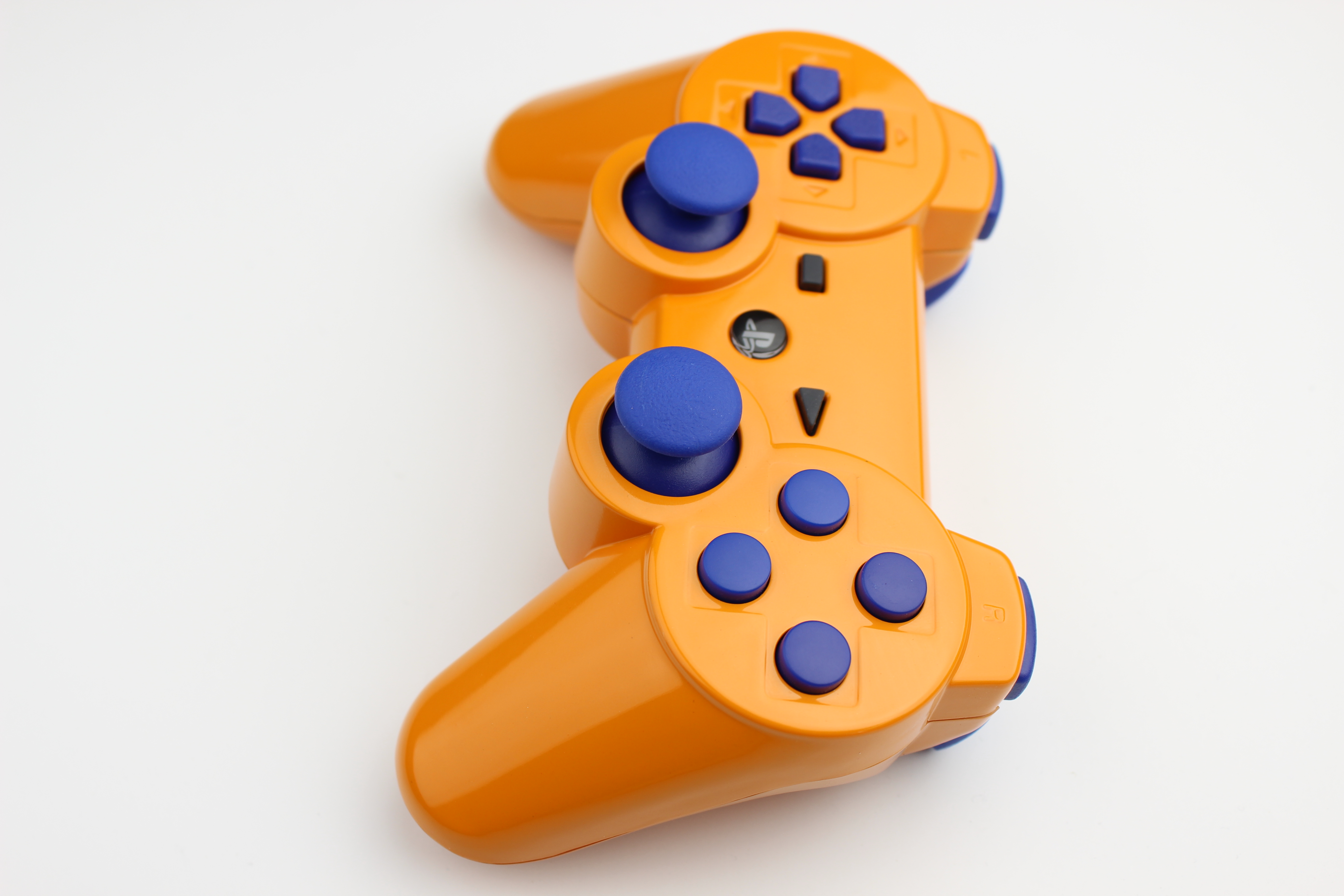 Orange PlayStation 3 Controller with Blue Buttons photos and movies
