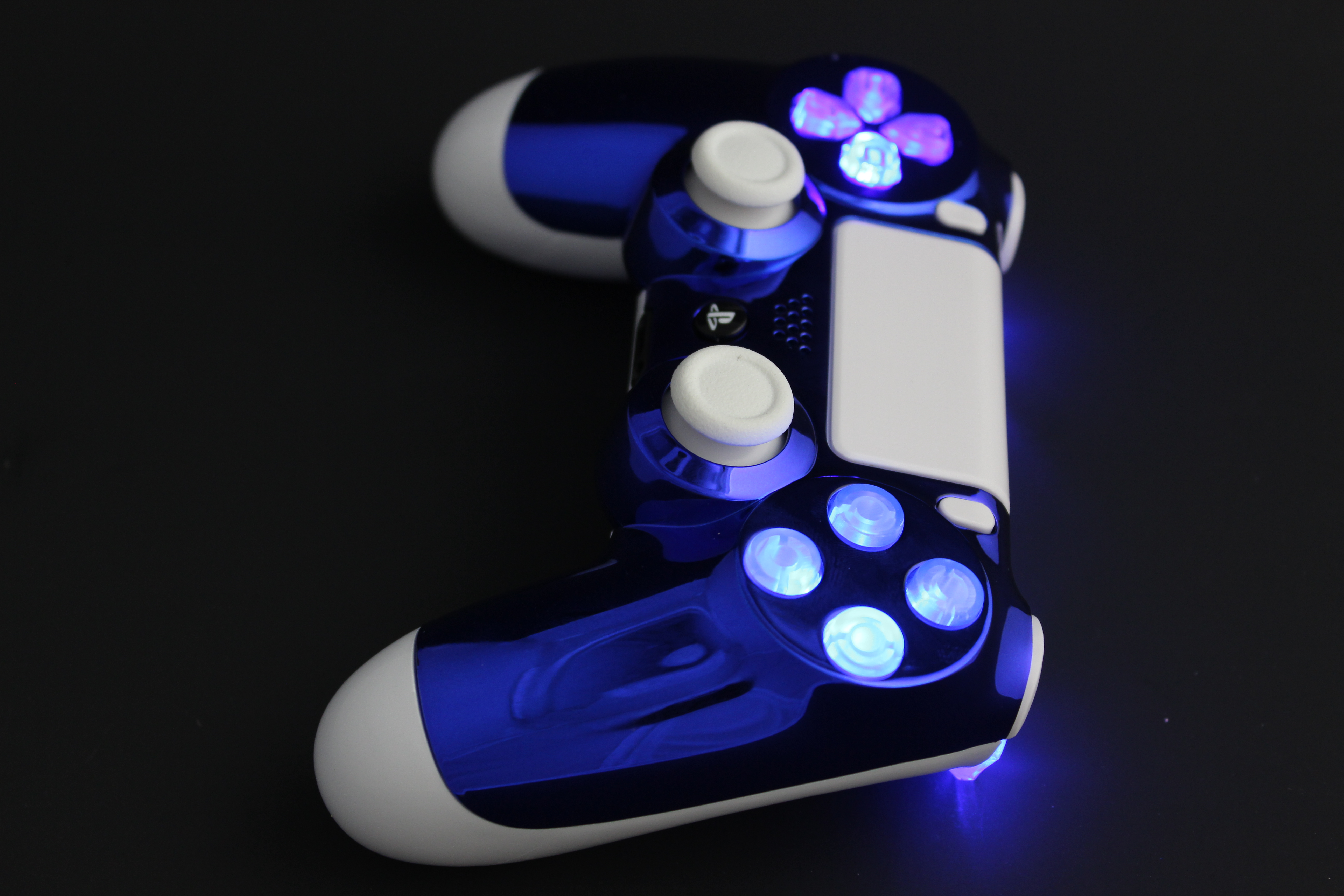 Blue Chrome and White Lit PlayStation 4 Controller photos and movies