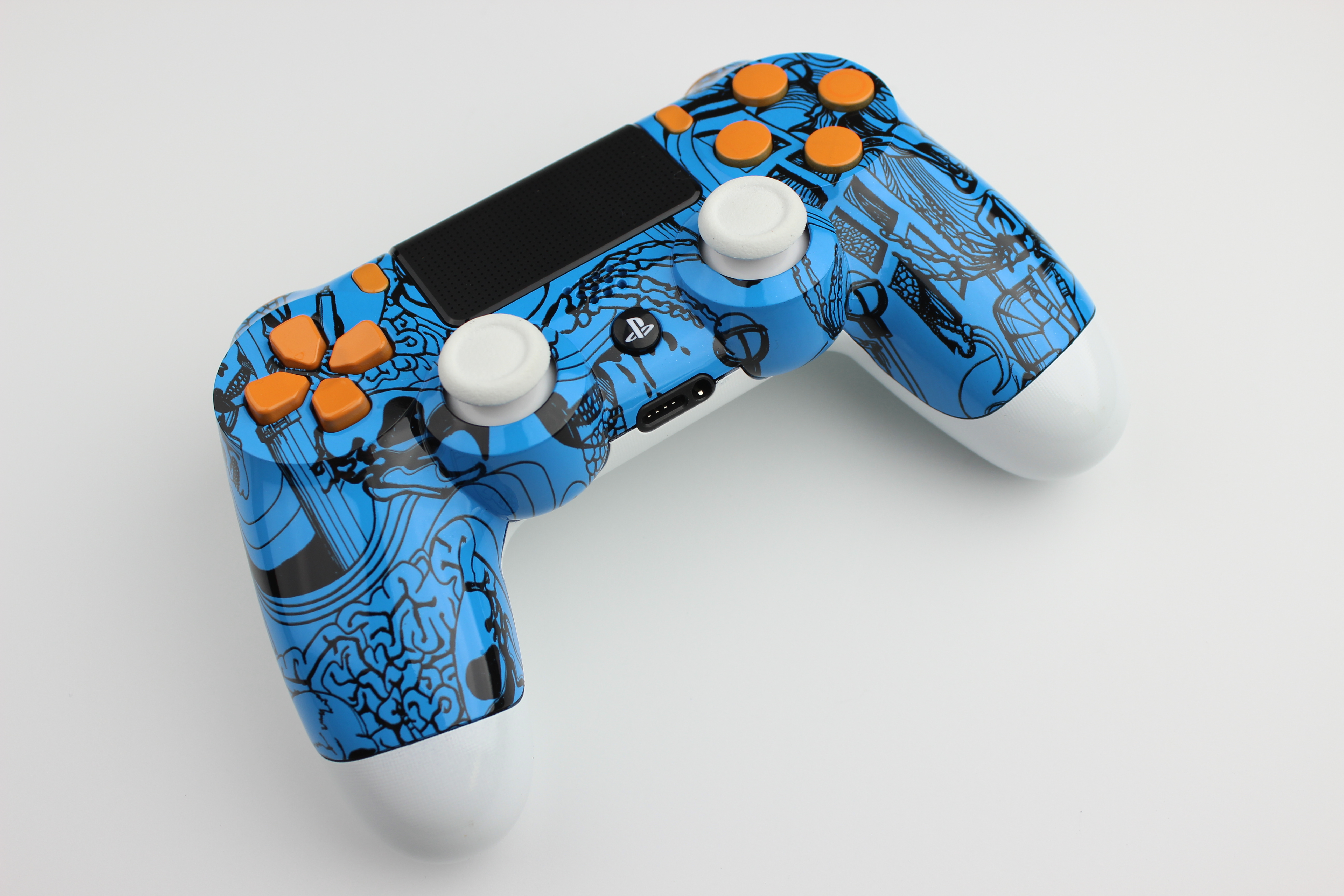 Blue Kooky Skulls PlayStation 4 Controller with Orange Buttons and White Sticks photos and movies