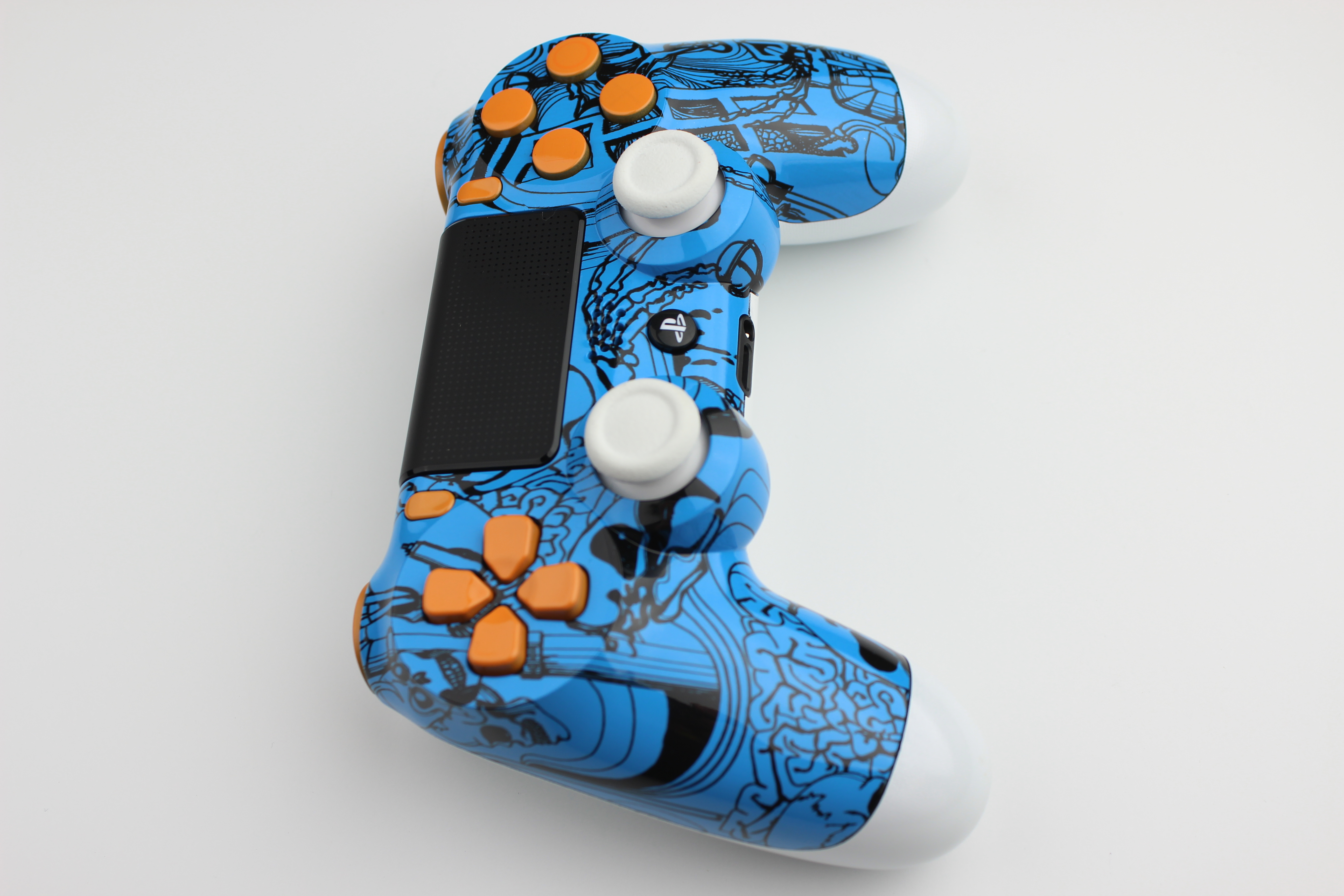 Bookmark and Share: Blue Kooky Skulls PlayStation 4 Controller with Orange Buttons and White Sticks 2