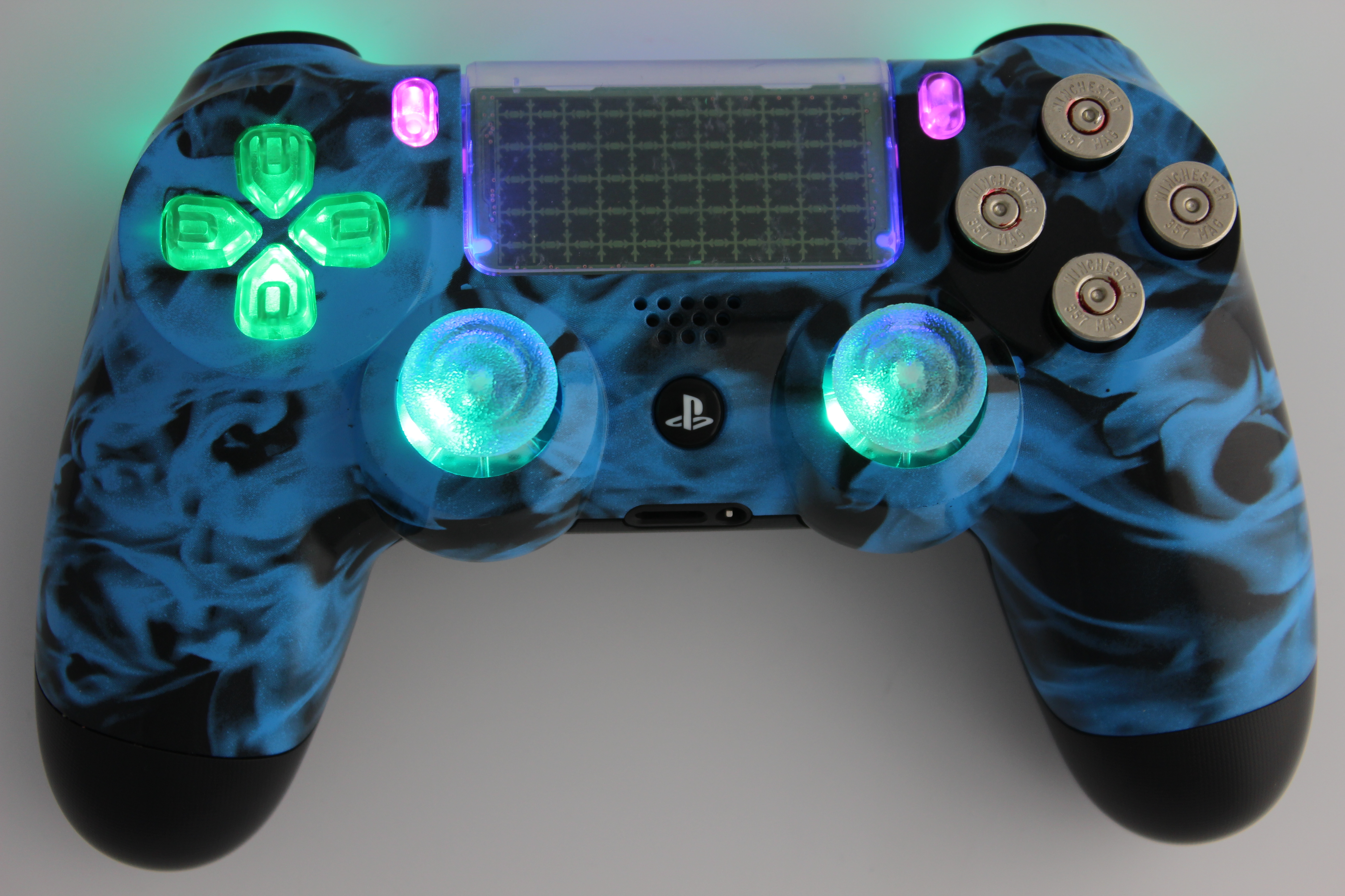 Blue Naughty Flames Lit PlayStation 4 Controller with Nickel Bullet Buttons photos and movies