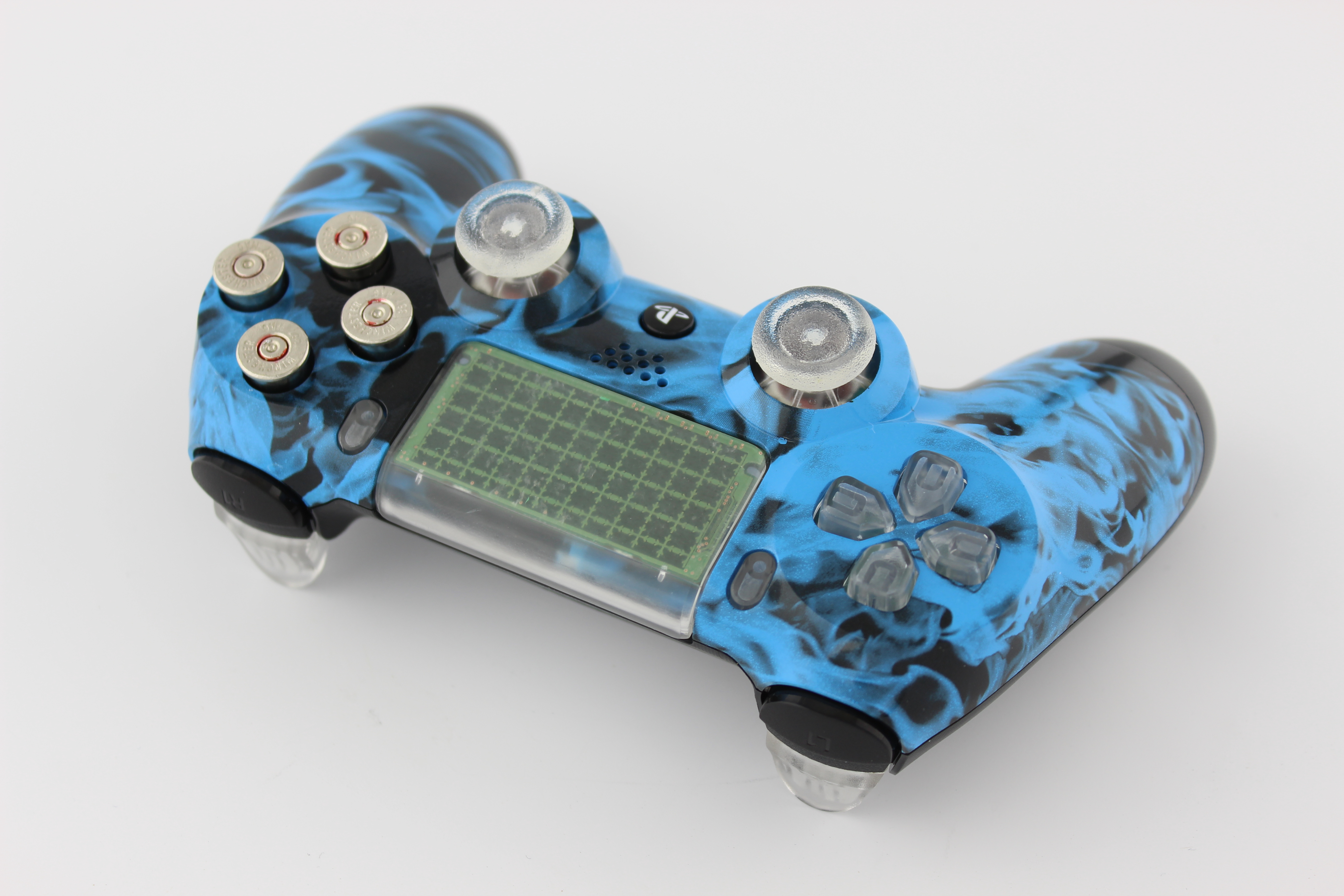 Blue Naughty Flames Lit PlayStation 4 Controller with Nickel Bullet Buttons photos and movies