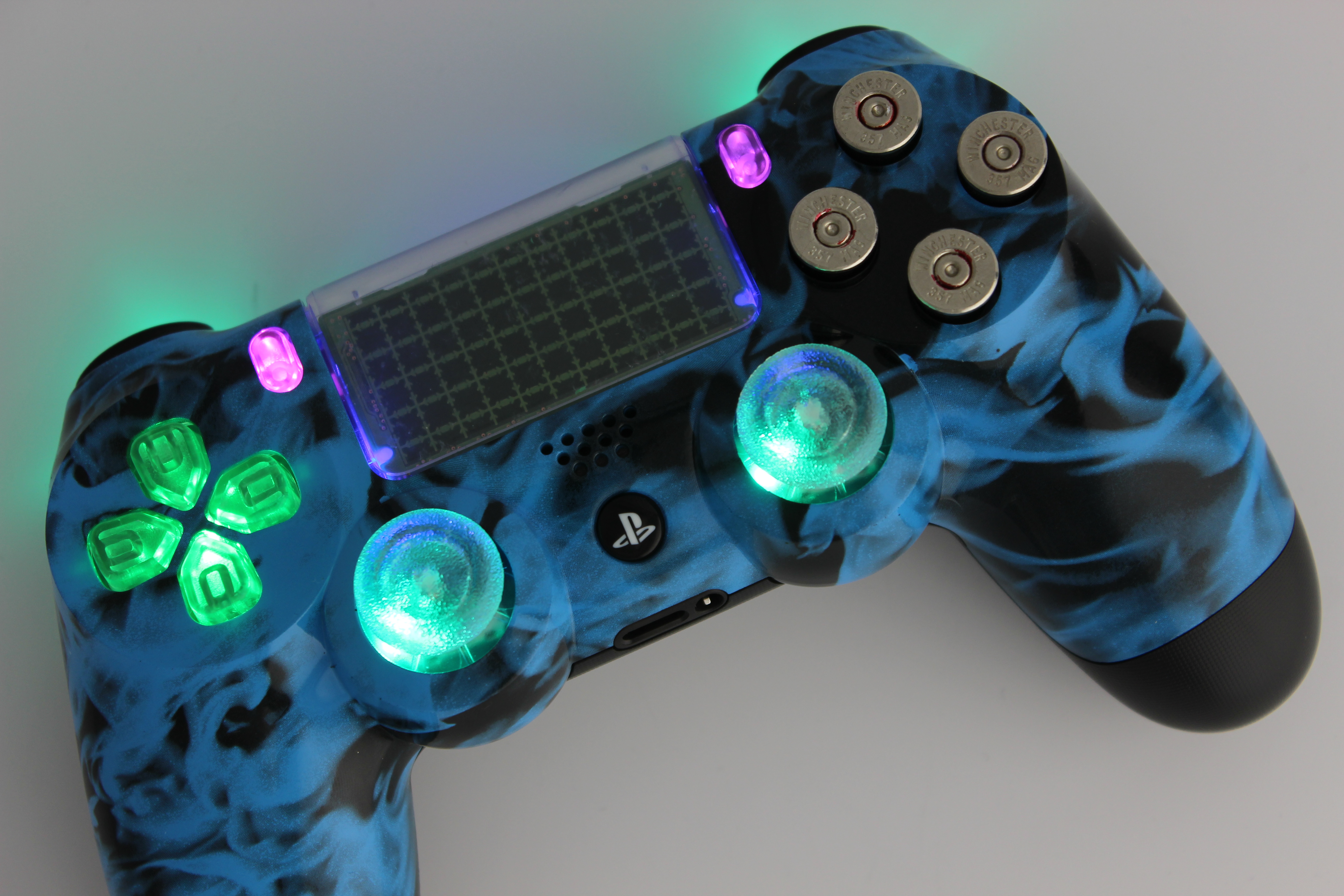 Blue Naughty Flames Lit PlayStation 4 Controller with Nickel Bullet Buttons photos and movies