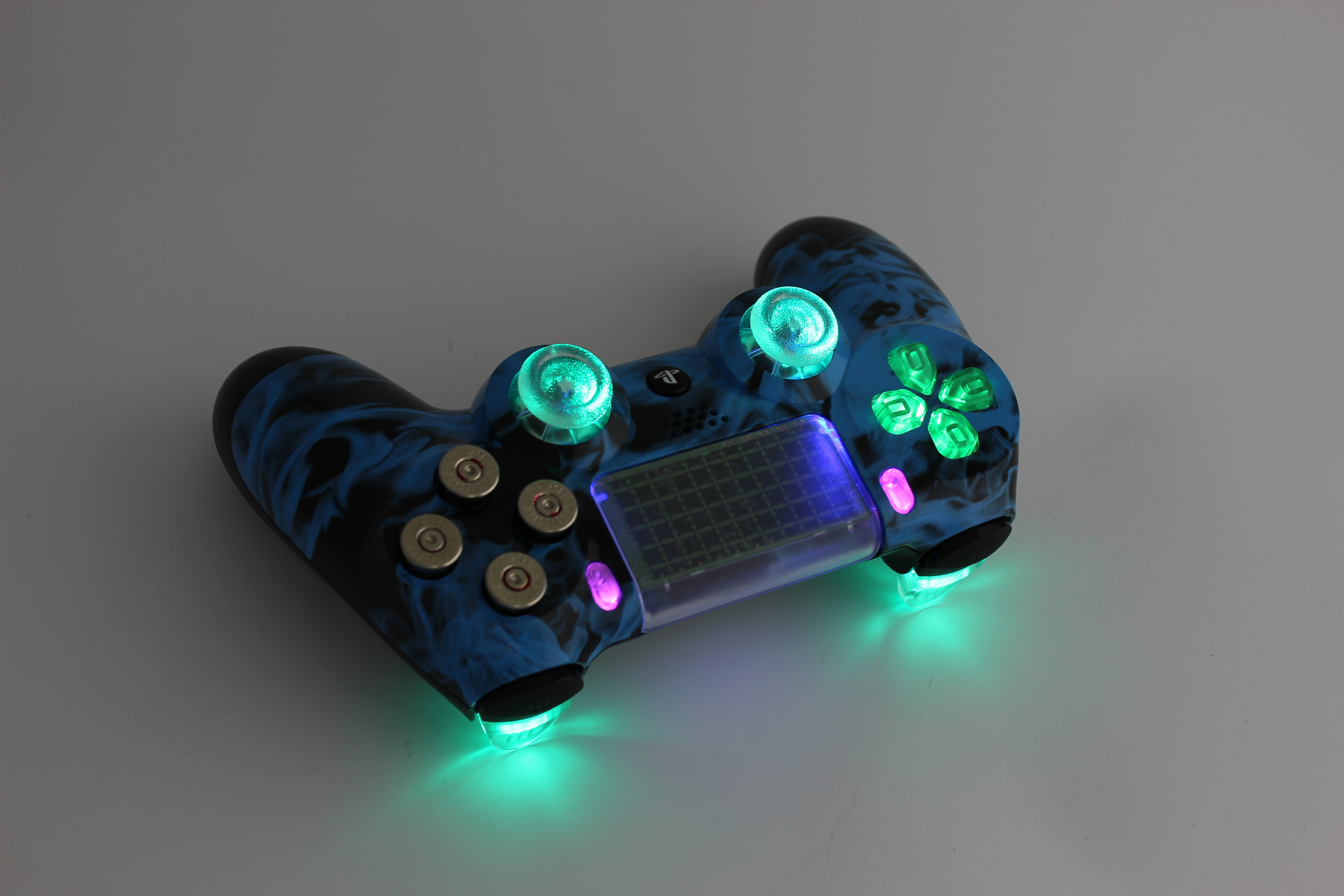Blue Naughty Flames Lit PlayStation 4 Controller with Nickel Bullet Buttons photos and movies