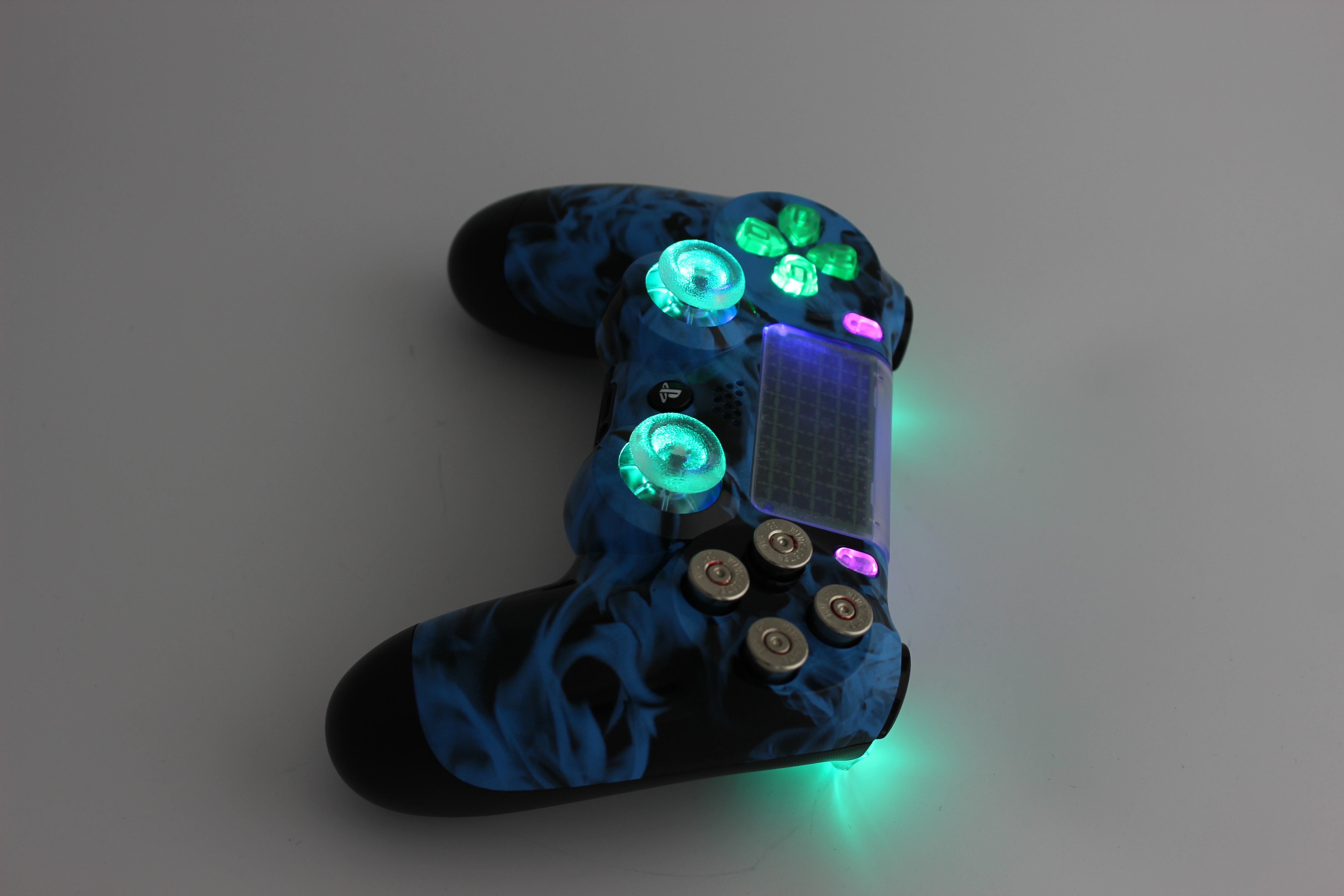 Blue Naughty Flames Lit PlayStation 4 Controller with Nickel Bullet Buttons photos and movies