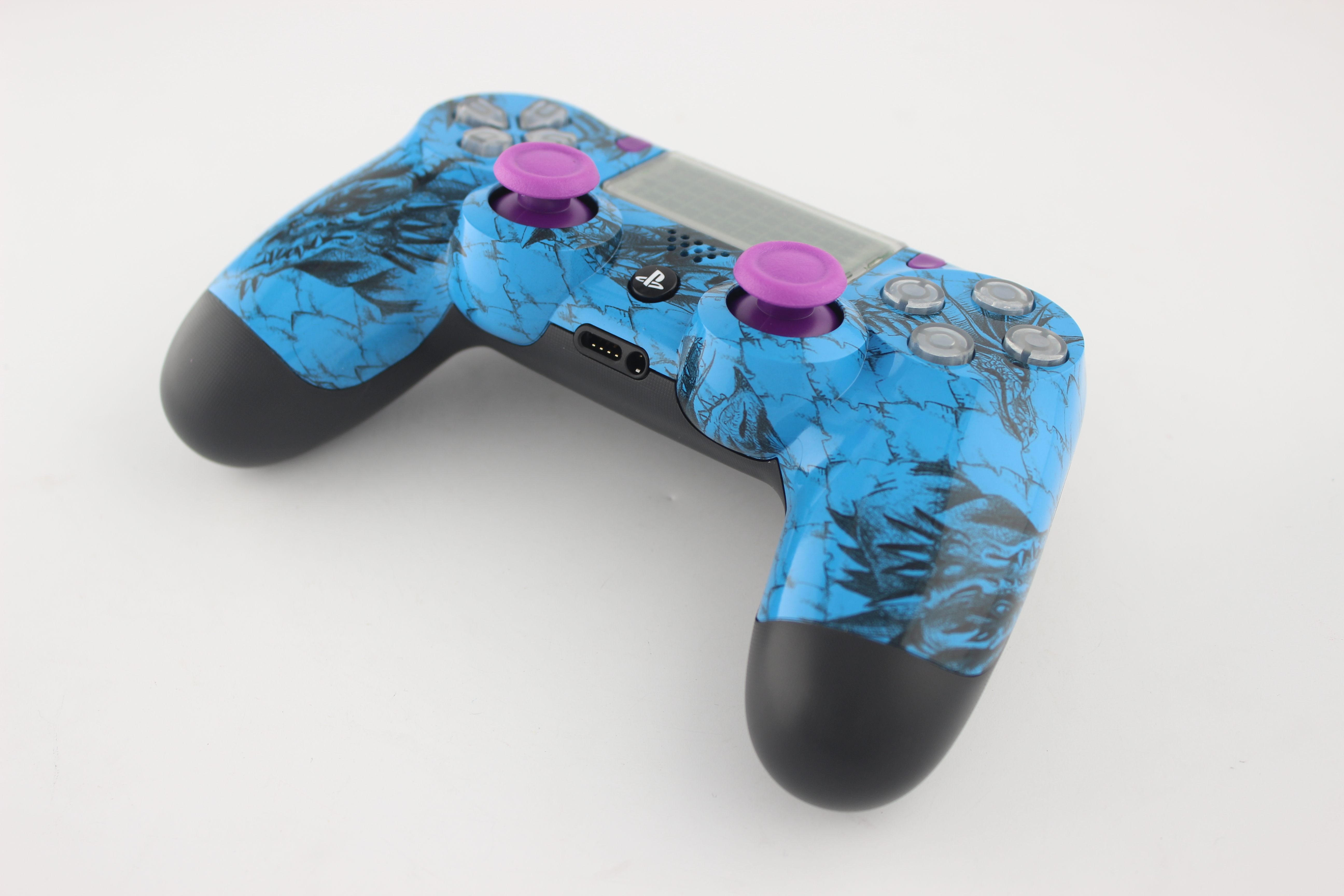 Blue Small Dragon Lit PlayStation 4 Controller with Purple Sticks photos and movies