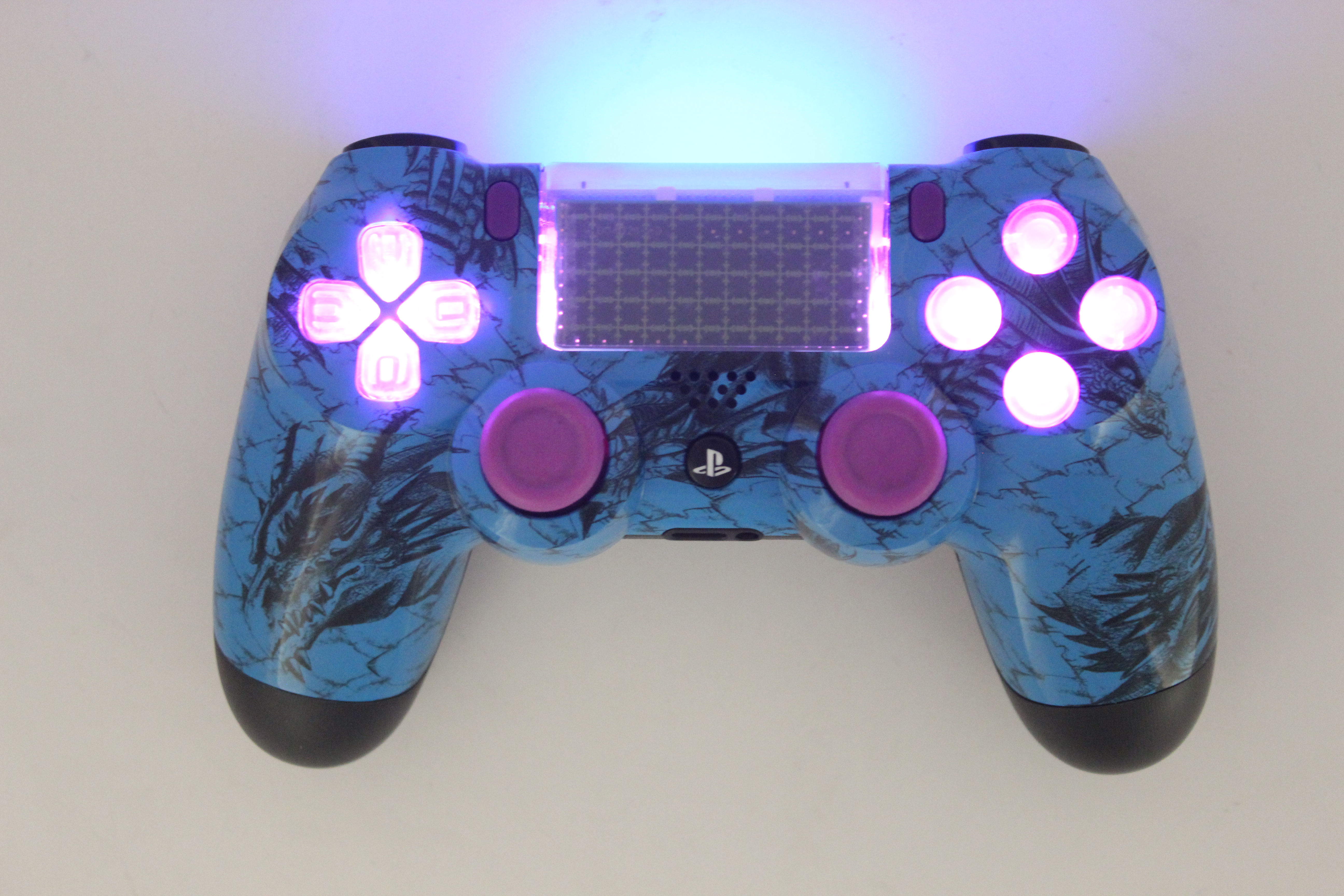 Blue Small Dragon Lit PlayStation 4 Controller with Purple Sticks