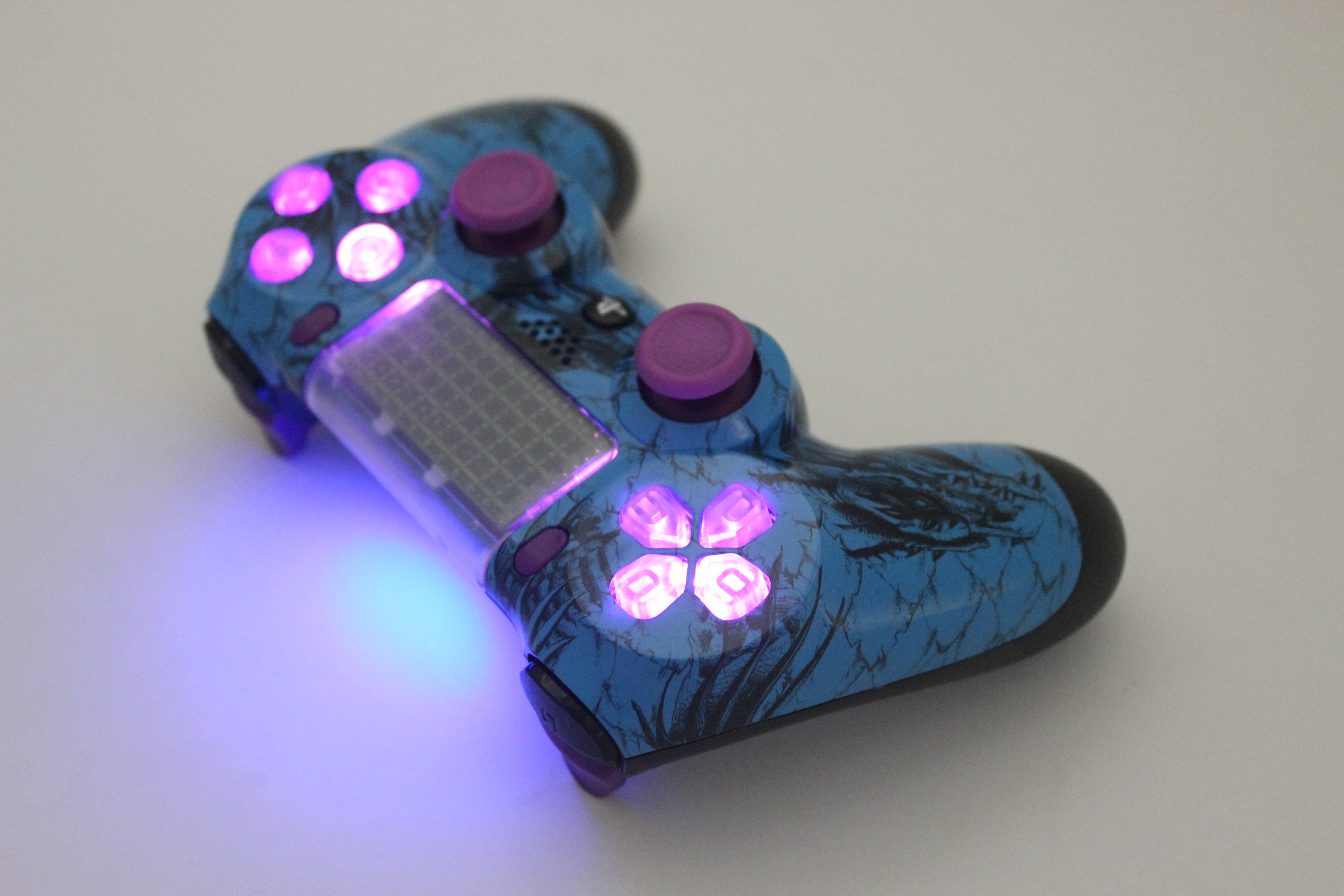 Blue Small Dragon Lit PlayStation 4 Controller with Purple Sticks photos and movies