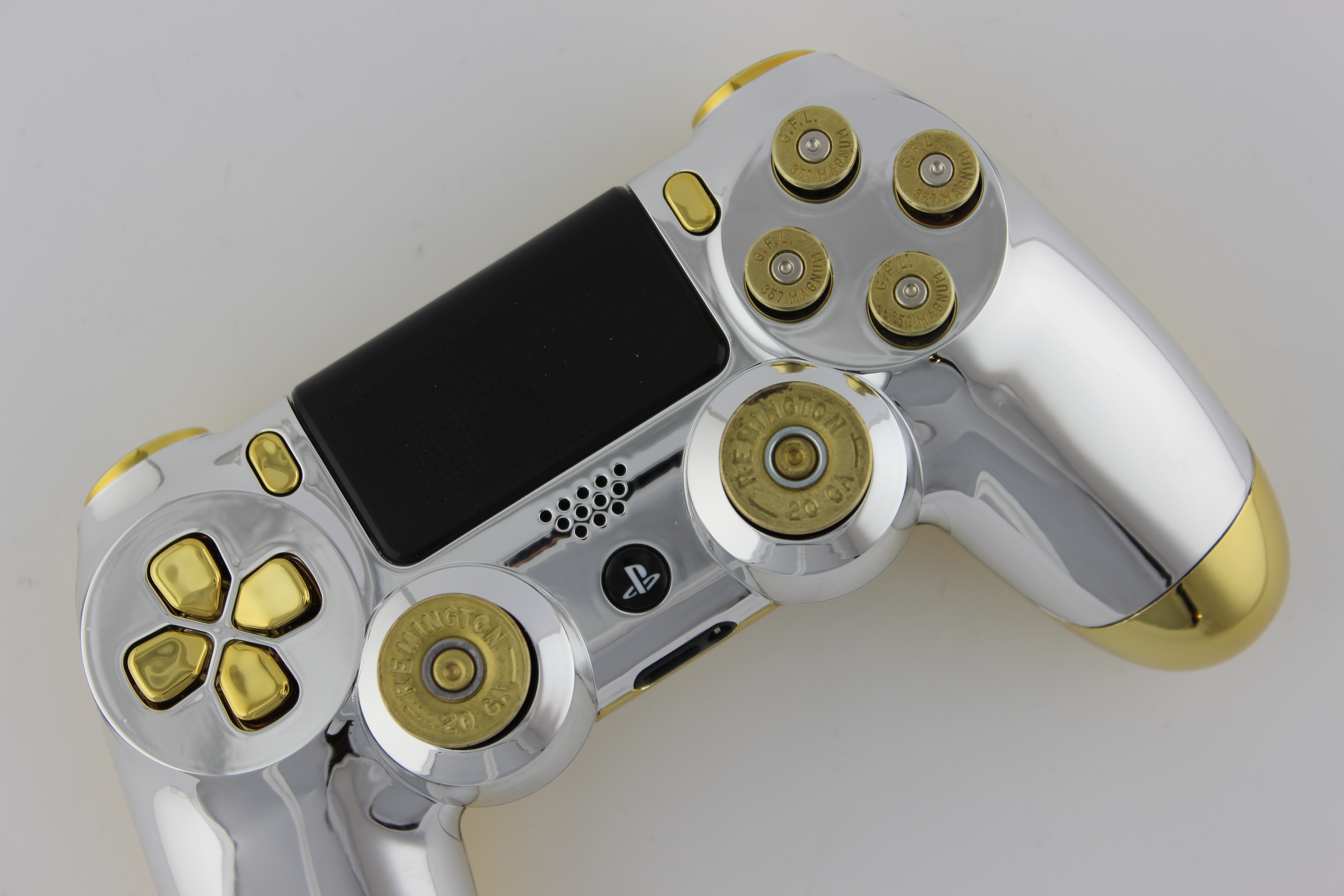 Chrome and Gold Chrome PlayStation 4 Controller with Brass Bullet Buttons 14