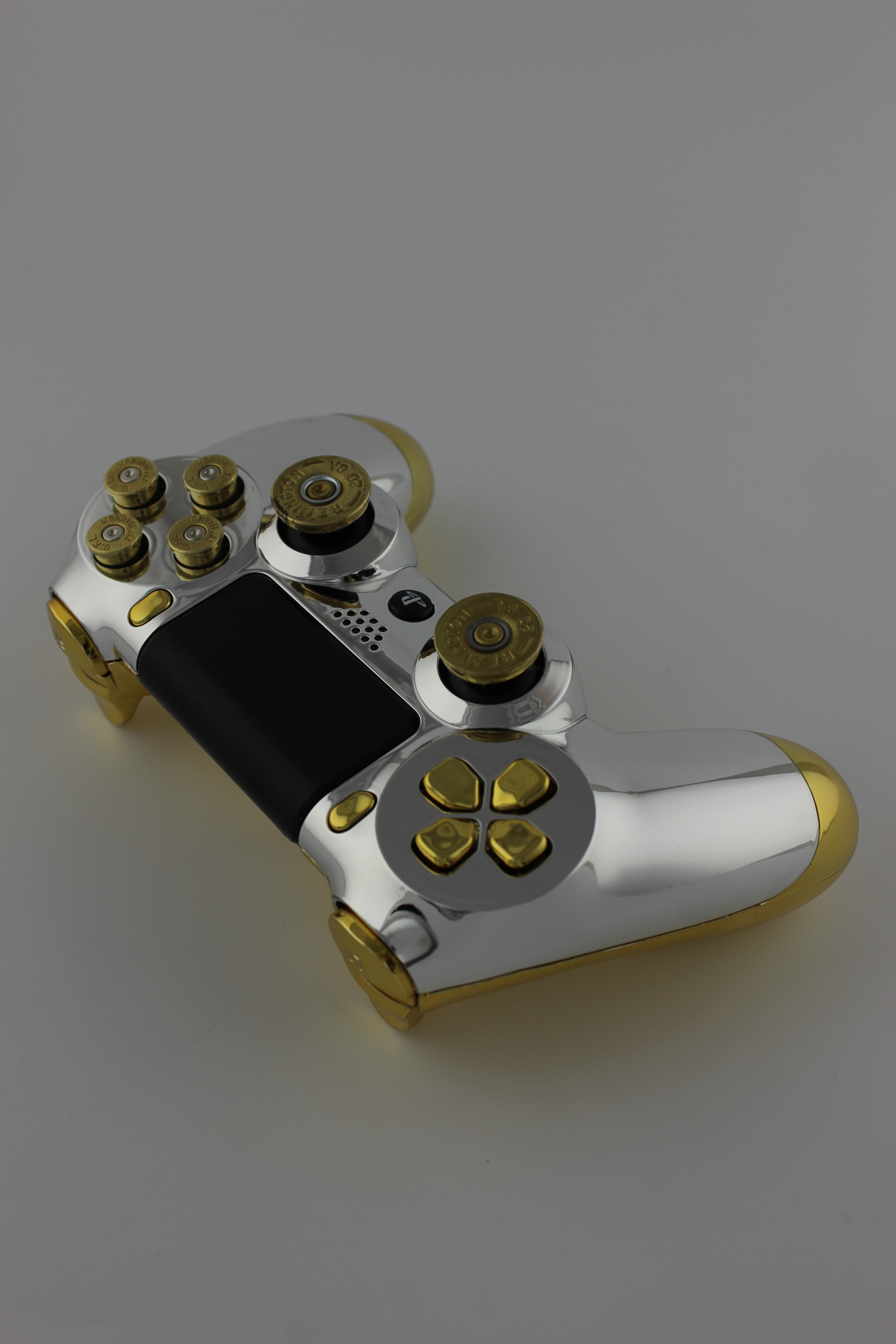 Chrome and Gold Chrome PlayStation 4 Controller with Brass Bullet Buttons 2