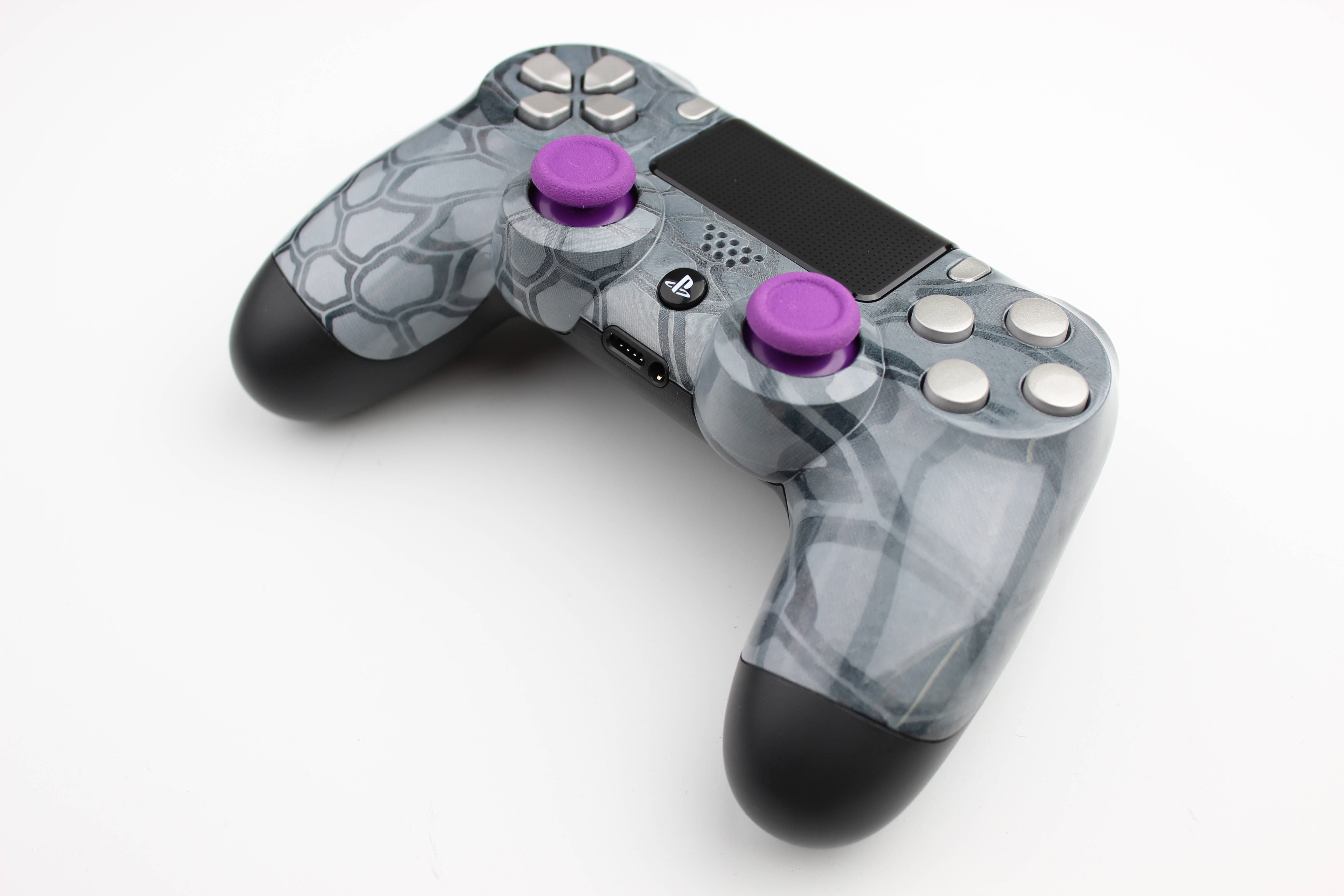 Grey Kryptek Typhon PlayStation 4 Contoller with Silver Buttons and Purple Sticks 9