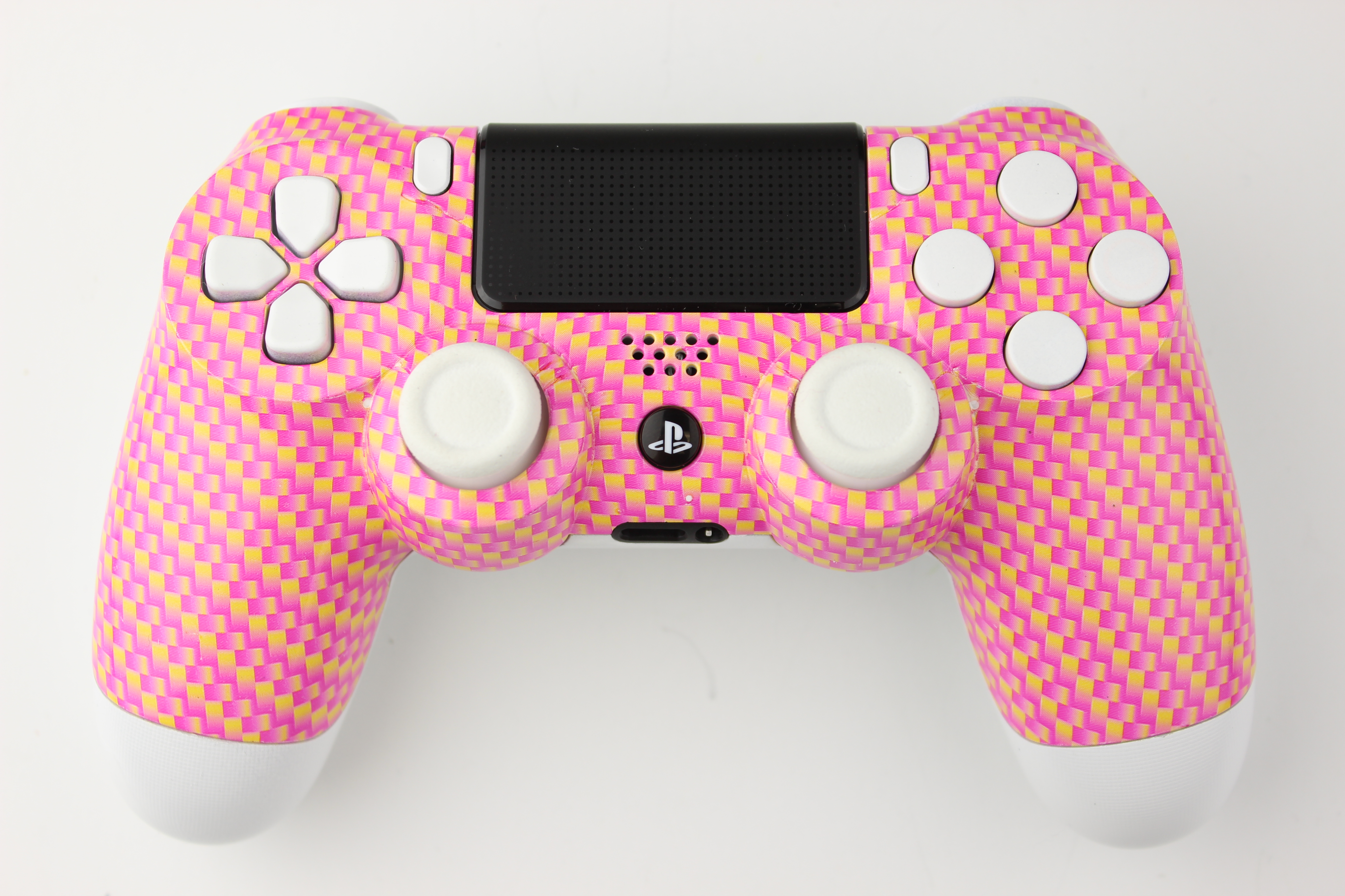 Pink and Gold Carbon Fiber and White PlayStation 4 Controller photos and movies