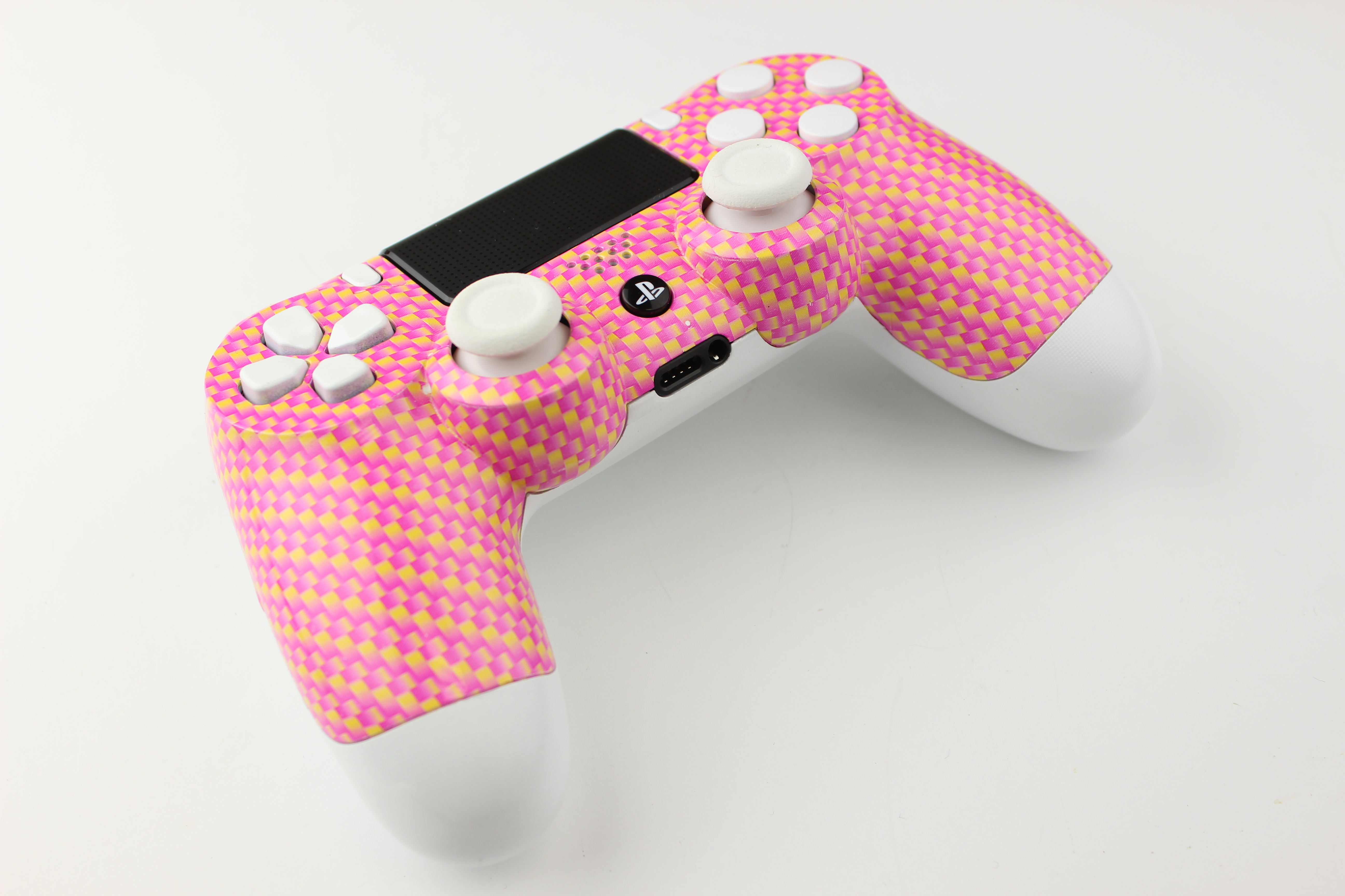 Pink and Gold Carbon Fiber and White PlayStation 4 Controller photos and movies