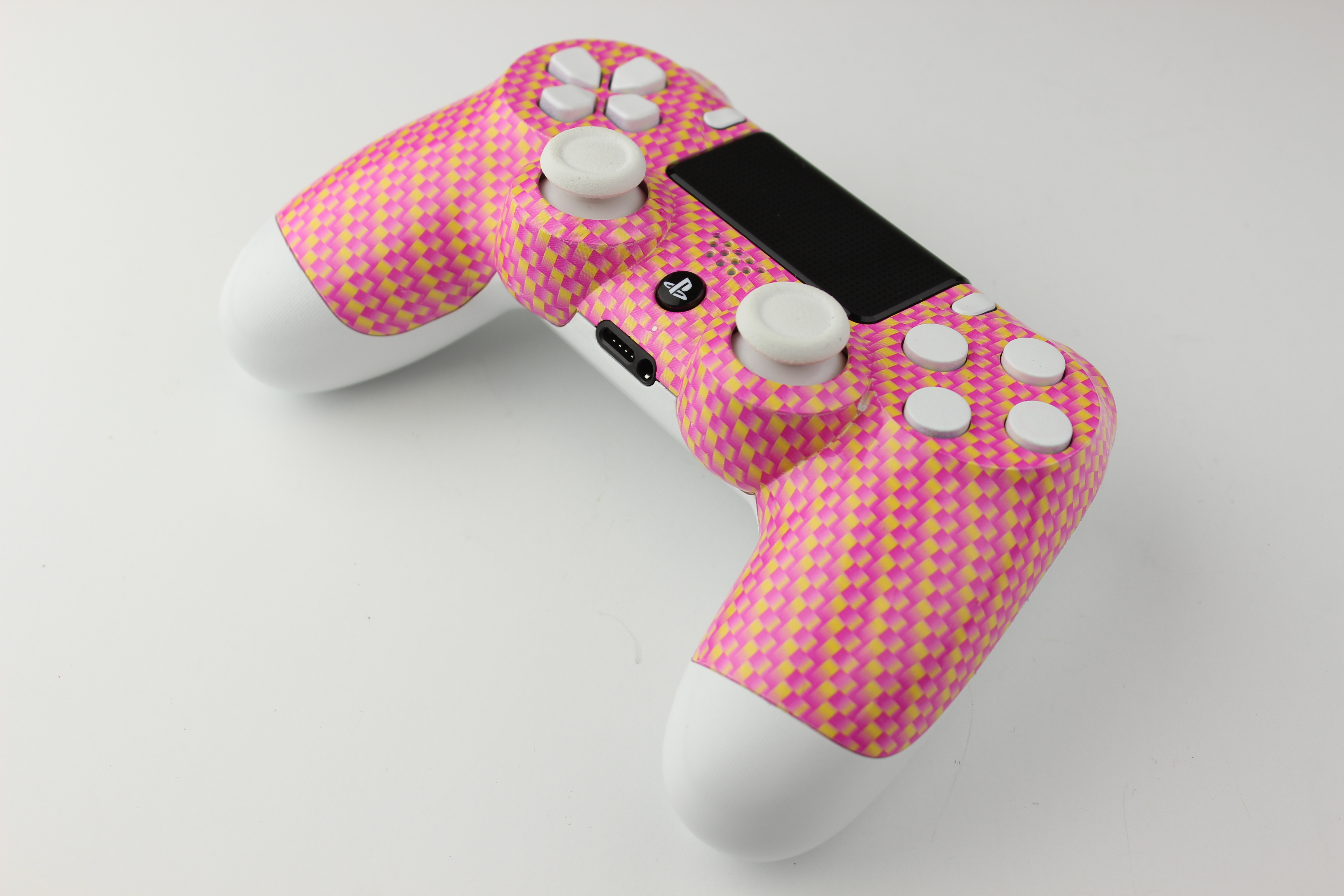 Pink and Gold Carbon Fiber and White PlayStation 4 Controller photos and movies