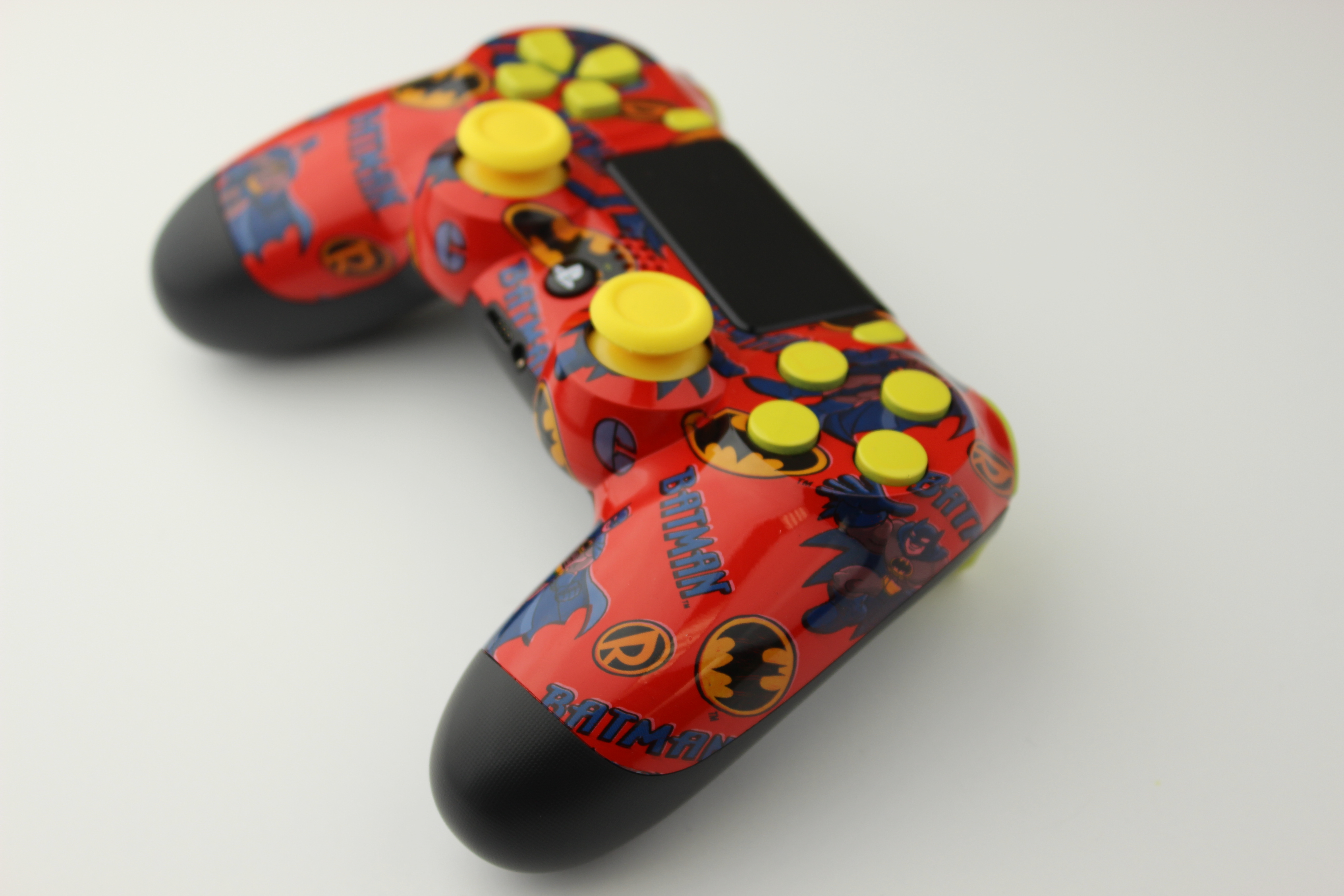 Red Batman and Yellow PlayStation 4 Controller photos and movies