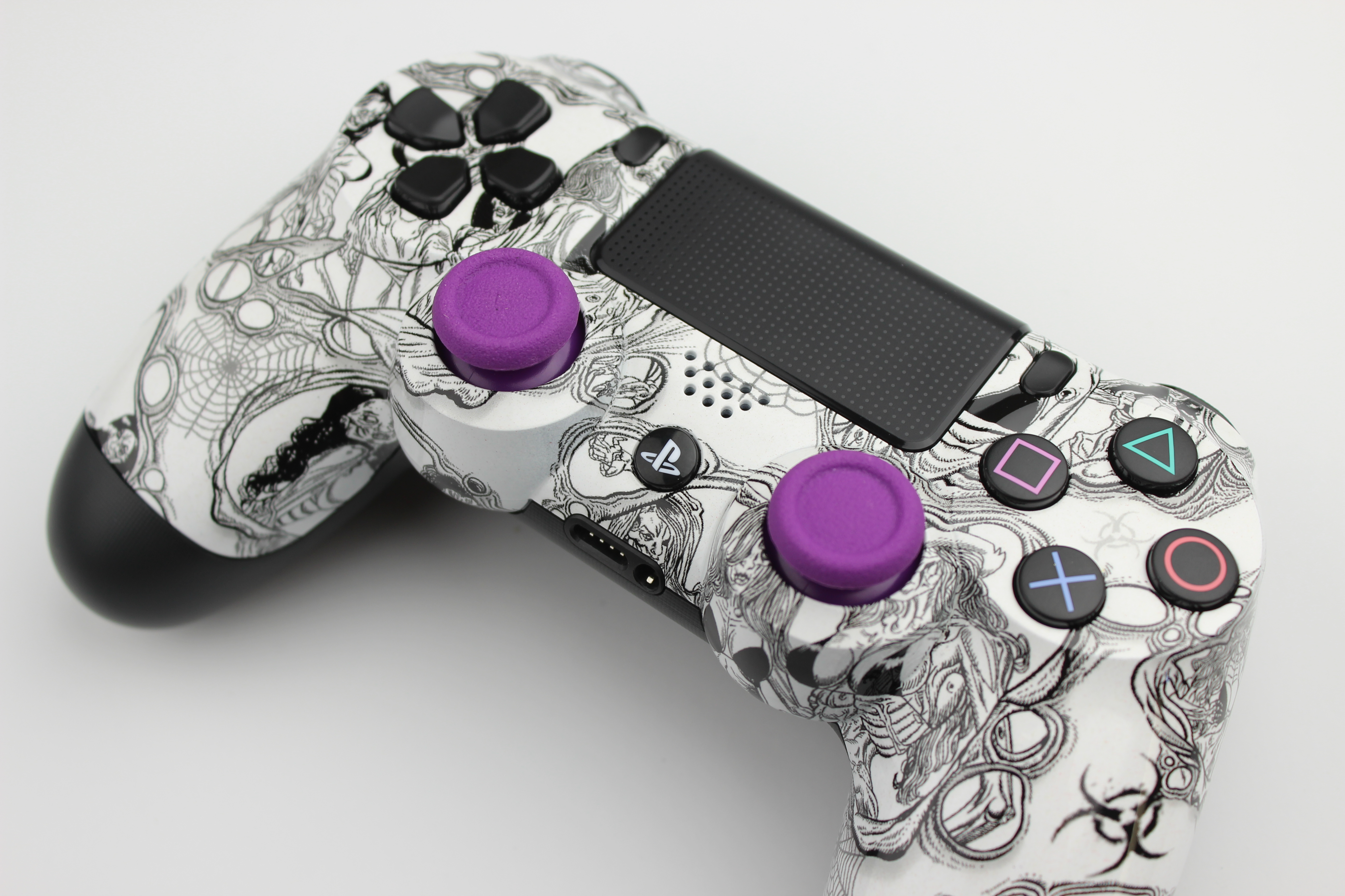 White Sexzy Zombies PlayStation 4 Contoller with Purple Sticks photos and movies