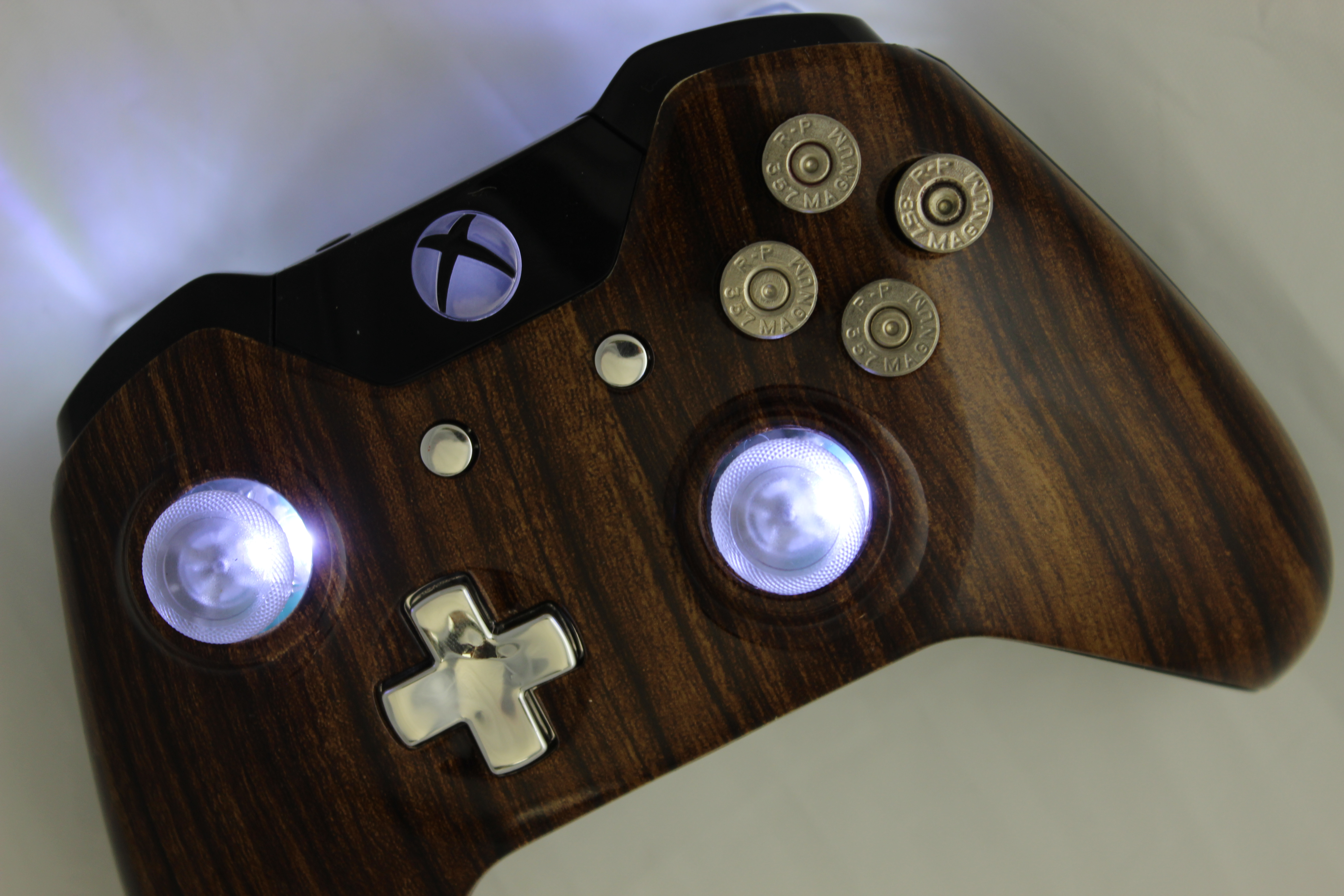 Lit Brown Straight Grain and Chrome Xbox One Controller photos and movies