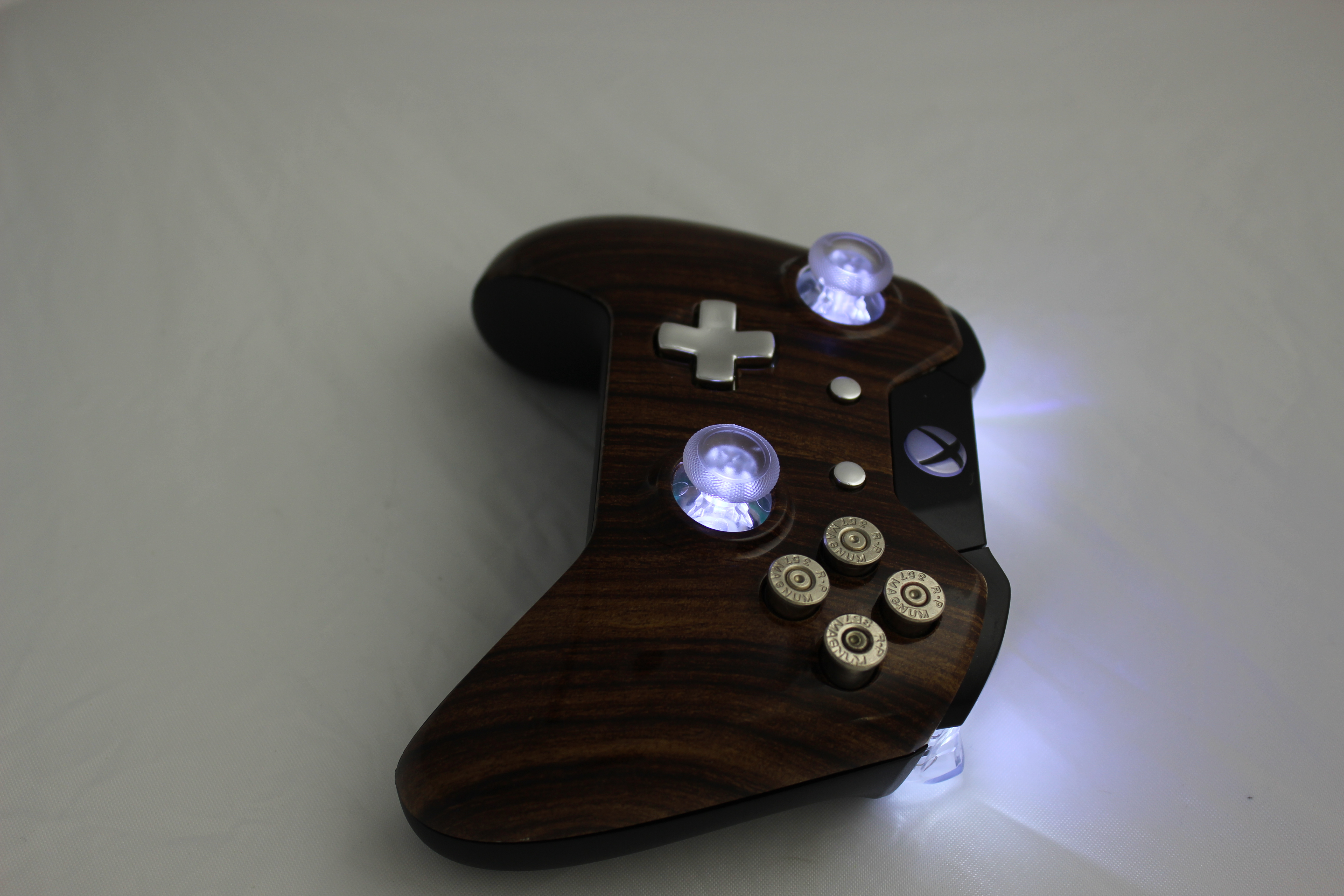 Lit Brown Straight Grain and Chrome Xbox One Controller photos and movies