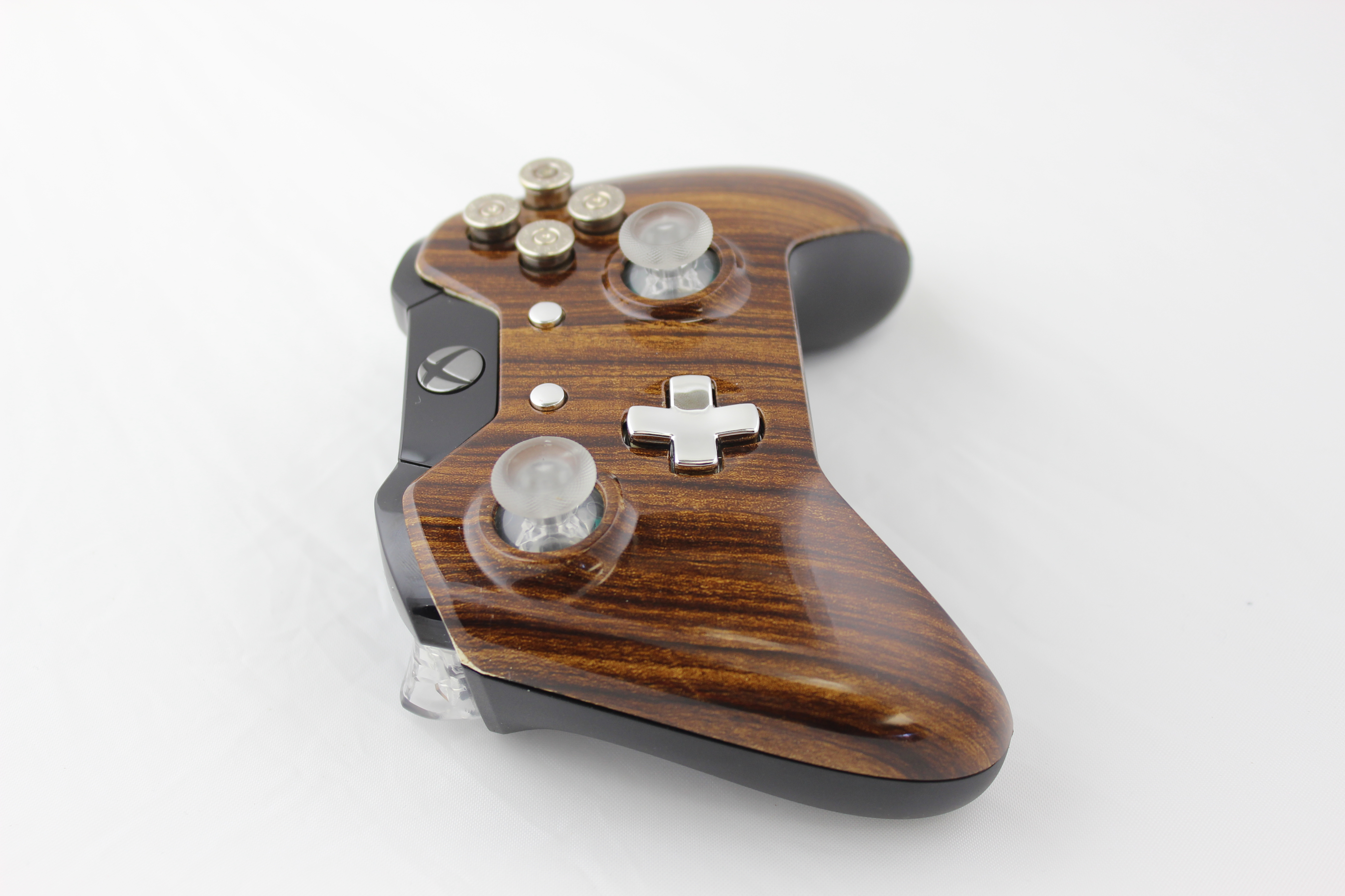 Lit Brown Straight Grain and Chrome Xbox One Controller photos and movies