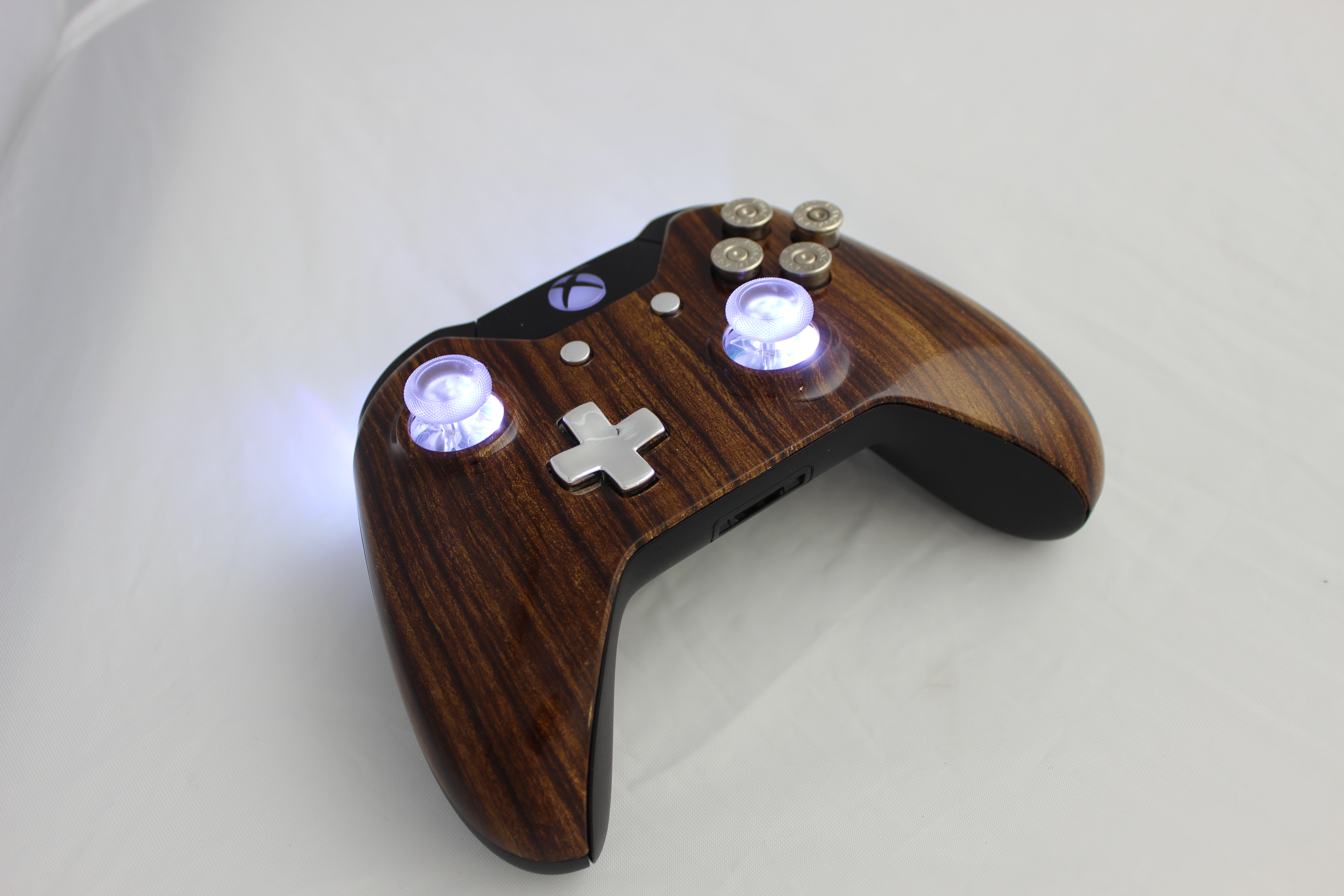 Lit Brown Straight Grain and Chrome Xbox One Controller photos and movies