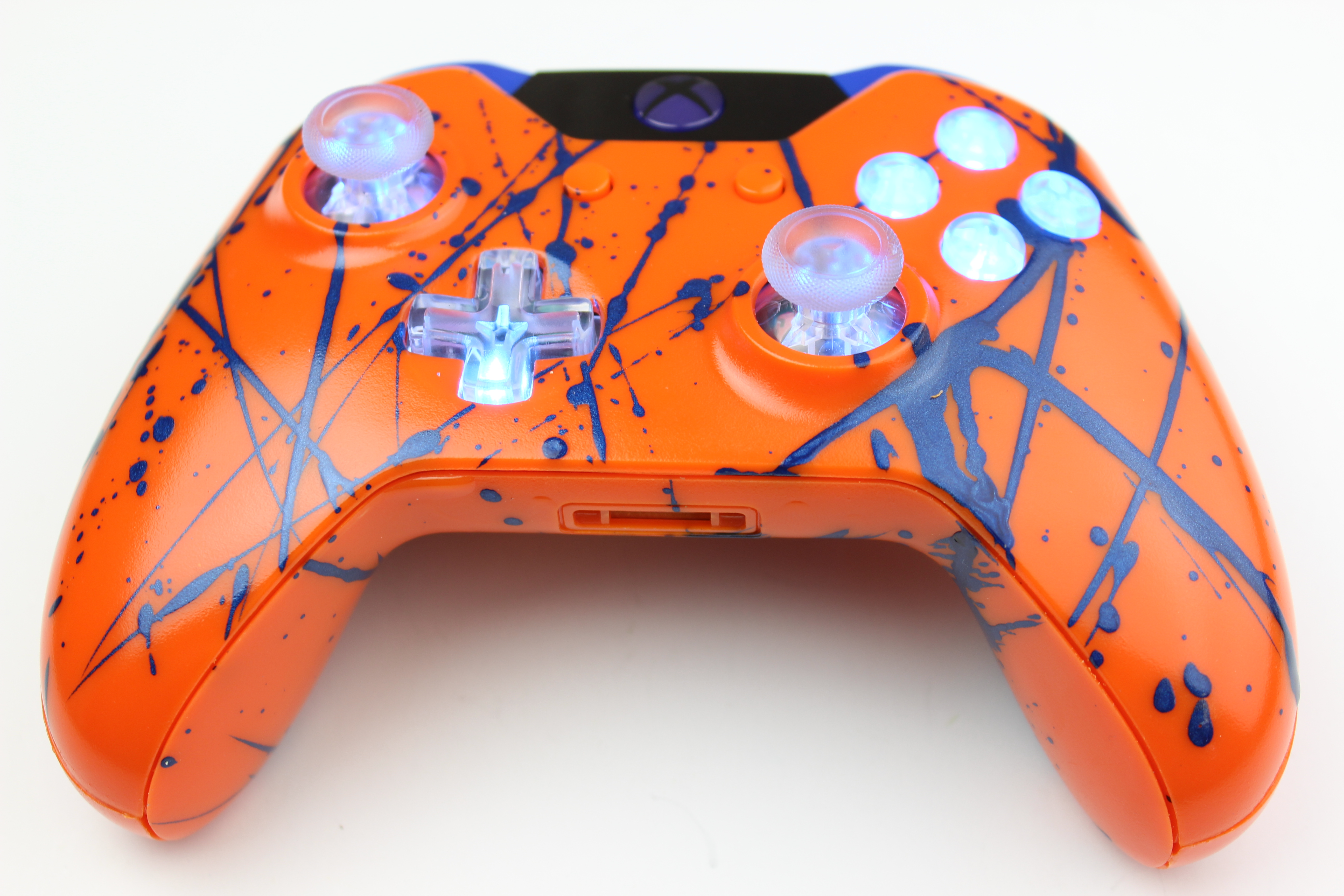 Orange Lit Blue Xbox One Controller with Metallic Blue Splatter photos and movies