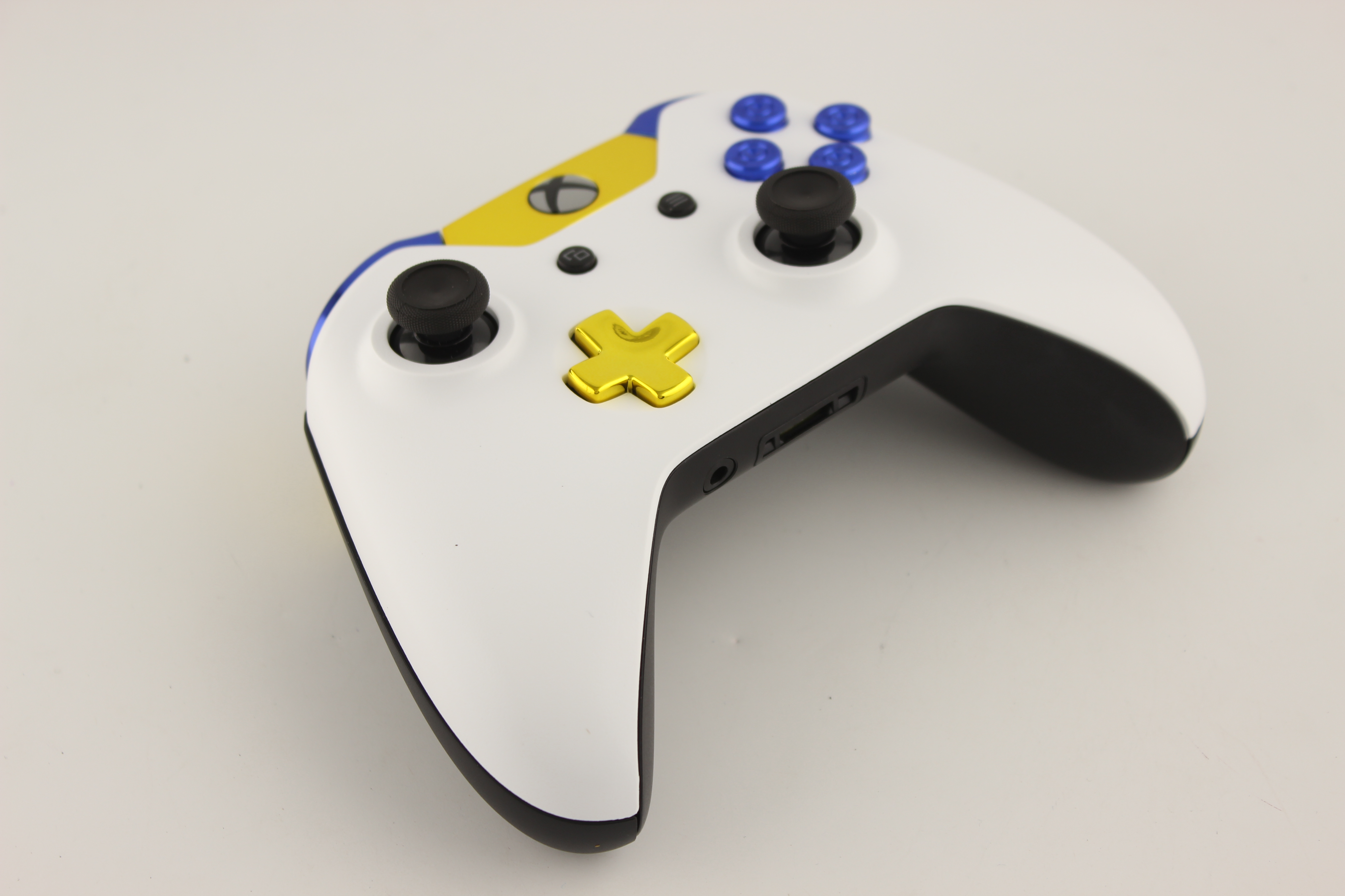 White and Gold Chrome Xbox One Controller with Blue Bullet Buttons 1