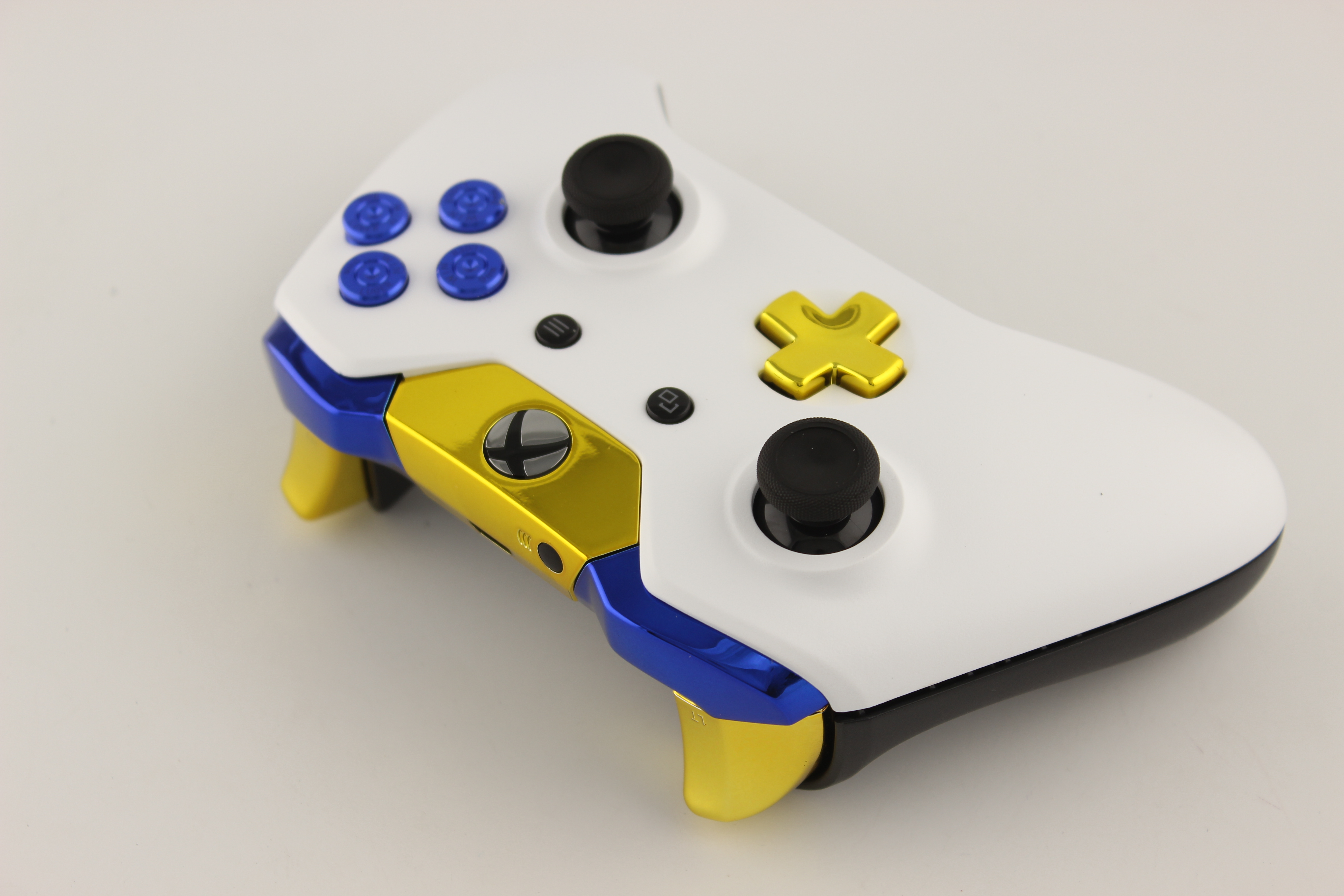 White and Gold Chrome Xbox One Controller with Blue Bullet Buttons 3