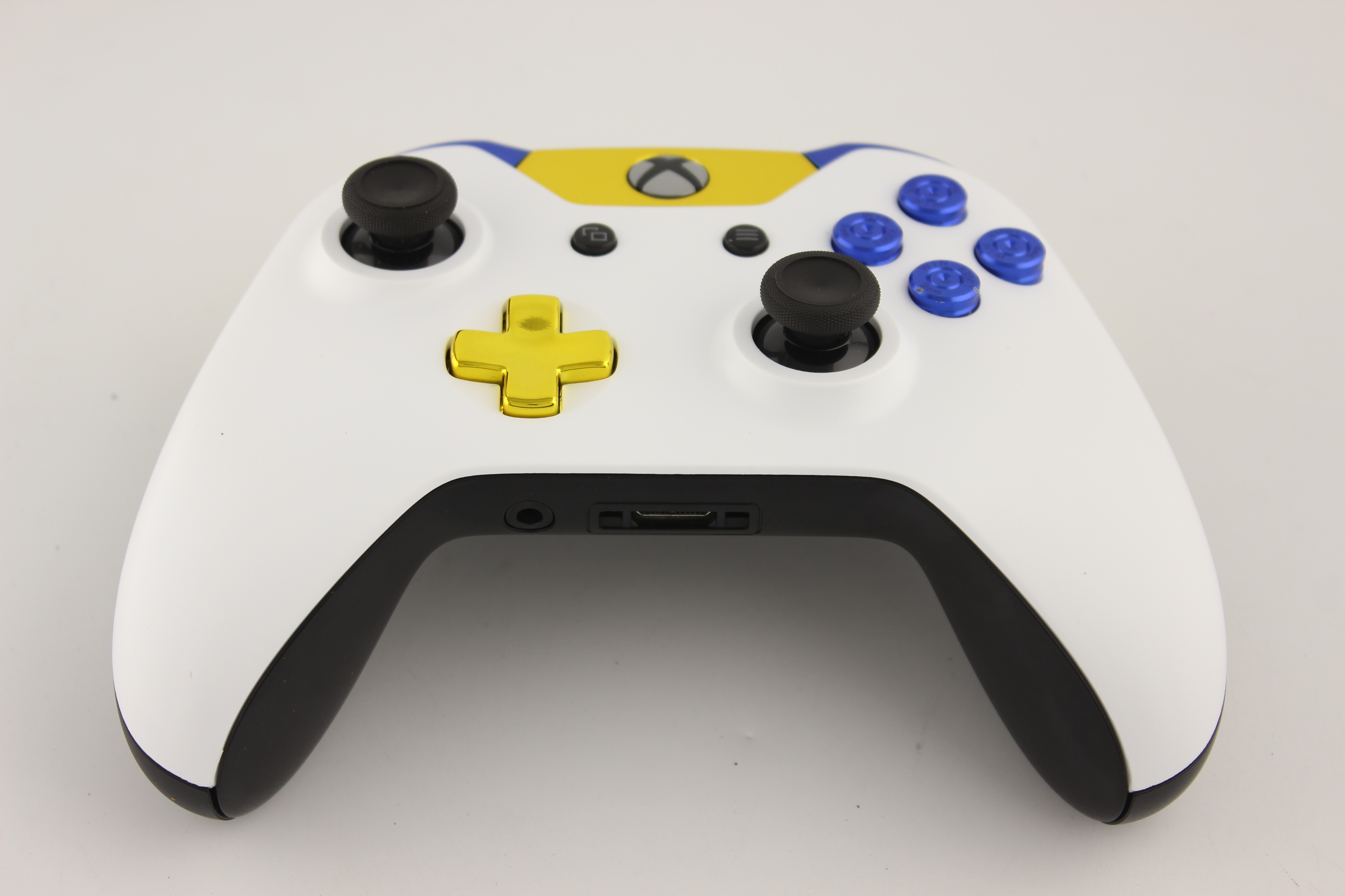 White and Gold Chrome Xbox One Controller with Blue Bullet Buttons 8